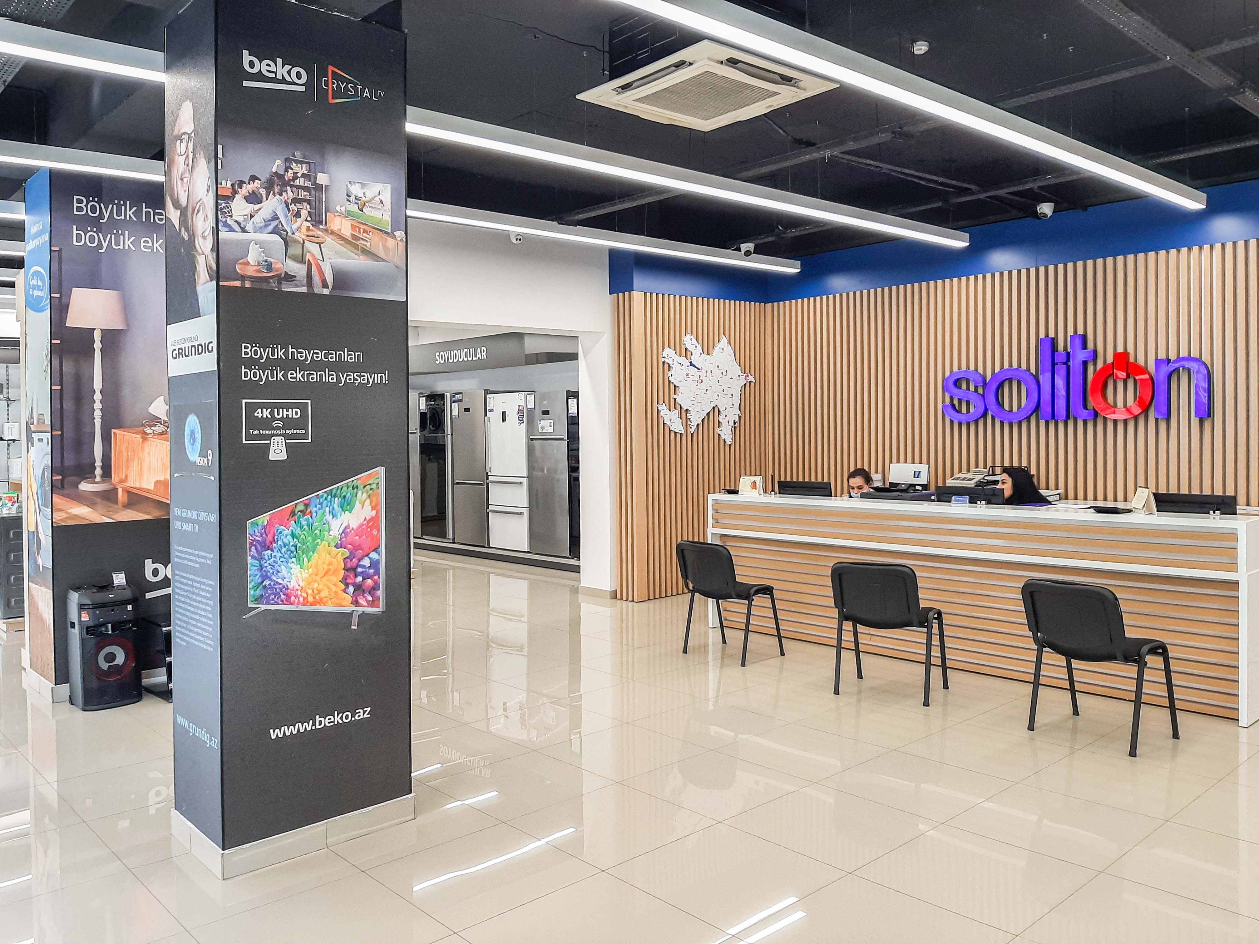 Eviniz üçün lazim olan hər bir məişət və mətbəx avadanlığı, elektronika məhsullarını yeni Soliton mağazasından əldə edə bilərsiniz. Digər Soliton mağazalarında olduğu kimi burada da rəsmi distribyutoru olduğu Beko, Blomberg, Grunding, Riffel, markalarının mətbəx və məişət avadanlıqları, bundan başqa Samsung, LG, Sony, Braun və s. məşhur markaların məhsullarının satışı nağd və ya hissə-hissə ödənişlə həyata keçirilir.