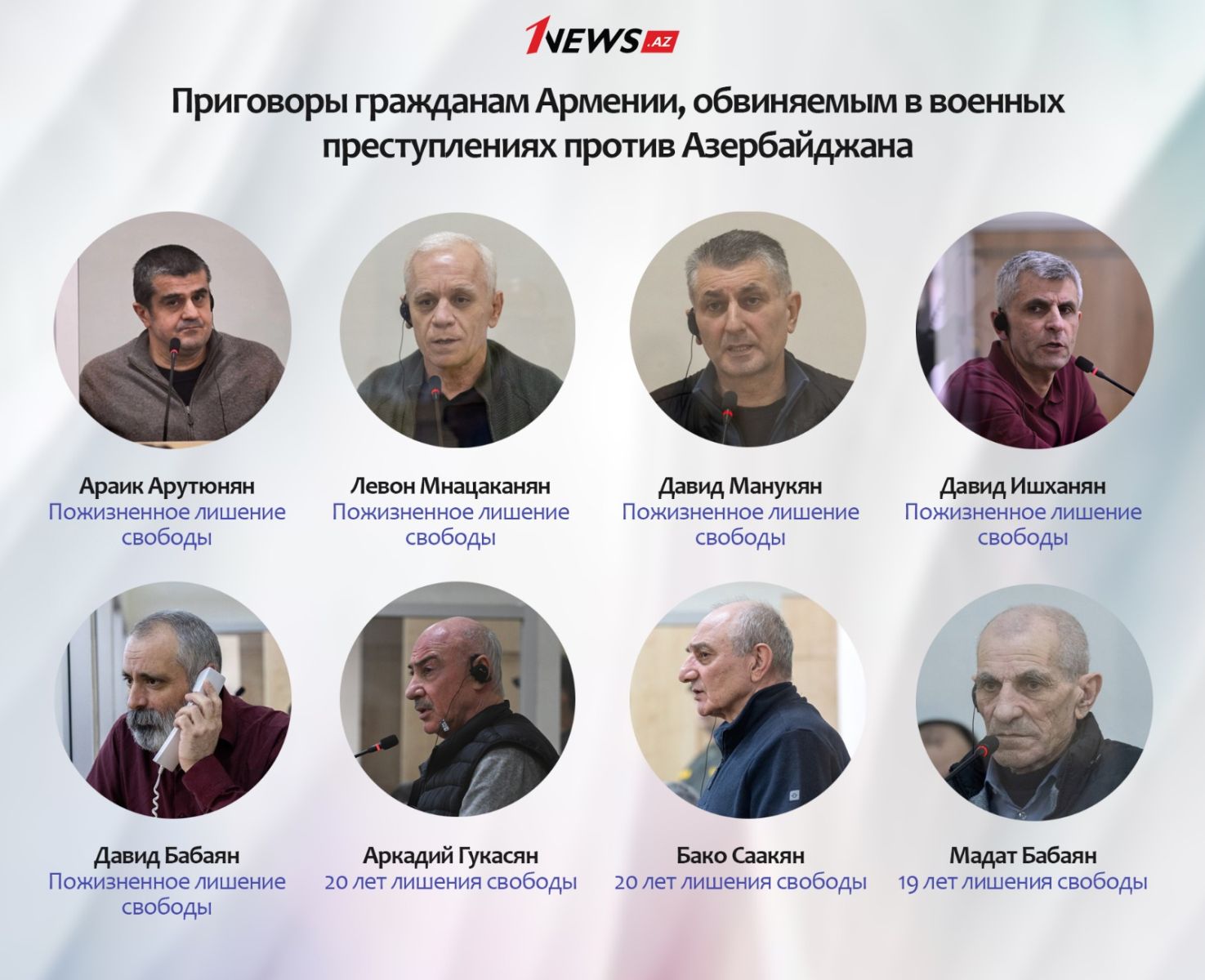 Решением суда пятеро членов незаконного образования приговорены к пожизненному лишению свободы за совершение особо тяжких преступлений, включая преступления против человечности и военные преступления. Бывшие лидеры самопровозглашенного режима Аркадий Гукасян и Бако Саакян приговорены только к 20 годам лишения свободы каждый. Участник Ходжалинской резни Мадат Бабаян осужден на 19 лет. При этом суд особо подчеркнул, что Гукасян, Саакян и Бабаян обвинялись по статьям, предусматривающим пожизненное лишение свободы, и вина каждого из них была доказана в ходе судебного следствия. Однако в силу того, что указанные лица достигли 65-летнего возраста до вынесения окончательного приговора, действующее законодательство Азербайджанской Республики не позволяет назначить им пожизненное наказание. Это обстоятельство следует расценивать не как смягчение ответственности, а как проявление гуманизма и строгого соблюдения закона со стороны азербайджанской судебной системы, которая не отступает от правовых норм даже в отношении лиц, виновных в тяжелейших преступлениях.